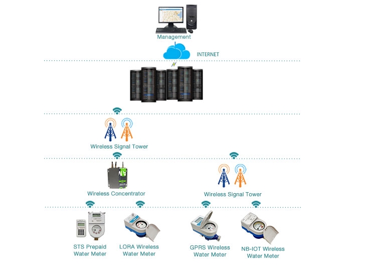 | Sävellys | Prepaid-vesimittari IC-kortti Kortinlukija Ohjelmisto | Lora-vesimittari Keskitin Toistin Palvele alustaa | GPRS-vesimittari Palvele alustaa | NB-IOT-vesimittari NB-IOT-lähetys tukiasema Palvele alustaa |